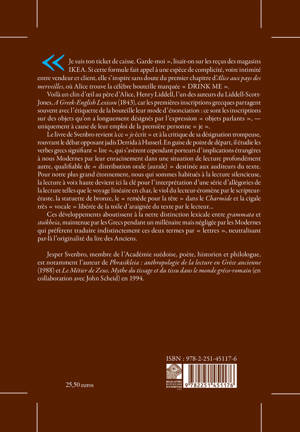 Je suis ton ticket de caisse. Garde-moi , lisait-on sur les recus des magasins IKEA. Si cette formule fait appel a une espece de complicite, voire intimite entre vendeur et client, elle s'inspire sans doute du premier chapitre d'Alice aux pays des merveilles, ou Alice trouve la celebre bouteille marquee DRINK ME .Voila un clin d'oeil au pere d'Alice, Henry Liddell, l'un des auteurs du Liddell-Scott-Jones, A Greek-English Lexicon (1843), car les premieres inscriptions grecques partagent souvent avec l'etiquette de la bouteille leur mode d'enonciation: ce sont les inscriptions sur des objets qu'on a longuement designes par l'expression objets parlants , - uniquement a cause de leur emploi de la premiere personne je .Le livre de Svenbro revient a ce je ecrit et a la critique de sa designation trompeuse, rouvrant le debat opposant jadis Derrida a Husserl. En guise de point de depart, il etudie les verbes grecs signifiant lire , qui s'averent cependant porteurs d'implications etrangeres a nous Modernes par leur enracinement dans une situation de lecture profondement autre, qualifiable de distribution orale (aurale) destinee aux auditeurs du texte.Pour notre plus grand etonnement, nous qui sommes habitues a la lecture silencieuse, la lecture a voix haute devient ici la cle pour l'interpretation d'une serie d'allegories de la lecture telles que le voyage lineaire en char, le viol du lecteur-eromene par le scripteur-eraste, la statuette de bronze, le remede pour la tete dans le Charmide et la cigale tres vocale liberee de la toile d'araignee du texte par le lecteur...Ces developpements aboutissent a la nette distinction lexicale entre grammata et stoikheia, maintenue par les Grecs pendant un millenaire mais negligee par les Modernes qui preferent traduire indistinctement ces deux termes par lettres , neutralisant par-la l'originalite du lire des Anciens.