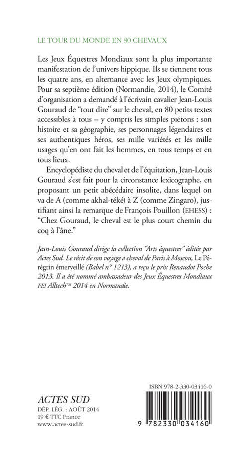 Partant du principe qu'il suffit de connaître les chevaux pour les aimer, cet ouvrage s'adresse à tous, piéton indécrottable ou hippologue distingué, afin de nous proposer une promenade dans l'univers du cheval. Un tour du monde en 80 petits textes réunis en abécédaire : accumulation d'anecdotes, de faits minuscules, contribuant à montrer, à travers le temps et l'espace, l'incroyable proximité du cheval et de l'homme.