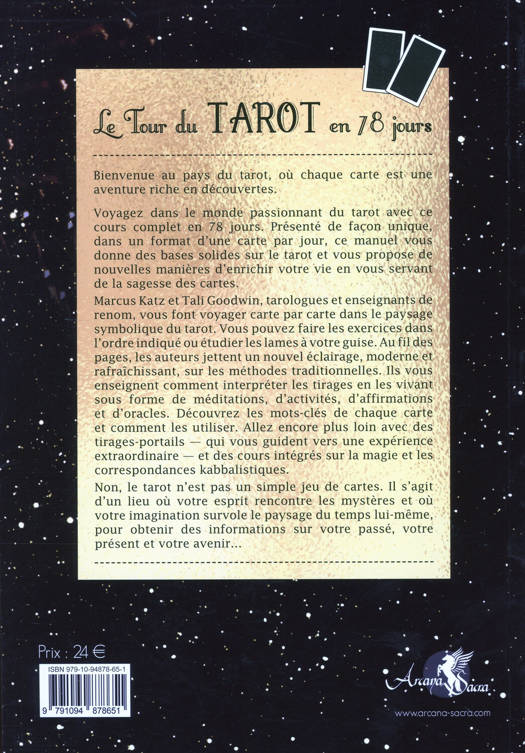 Bienvenue au pays du tarot, où chaque carte est une aventure riche en découvertes Voyagez dans le monde passionnant du tarot avec ce cours complet en 78 jours. Présenté de façon unique, dans un format d’une carte par jour, ce manuel vous donne des bases solides sur le tarot et vous propose de nouvelles manières d’enrichir votre vie en vous servant de la sagesse des cartes. Marcus Katz et Tali Goodwin, tarologues et enseignants de renom, vous font voyager carte par carte dans le paysage symbolique du tarot. Vous pouvez faire les exercices dans l’ordre indiqué, ou étudier les lames à votre guise. Au fil des pages, les auteurs jettent un nouvel éclairage, moderne et rafraîchissant, sur les méthodes traditionnelles. Ils vous enseignent comment interpréter les tirages en les vivant sous forme de méditations, d’activités, d’affirmations et d’oracles. Découvrez les mots-clés de chaque carte, et comment les utiliser. Allez encore plus loin avec des tirages-portails - qui vous guident vers une expérience extraordinaire - et des cours intégrés sur la magie et les correspondances kabbalistiques. Non, le tarot n’est pas un simple jeu de cartes. Il s’agit d’un lieu où votre esprit rencontre les mystères et où votre imagination survole le paysage du temps lui-même, pour obtenir des informations sur votre passé, votre présent et votre avenir… À propos des auteurs : Marcus Katz travaille comme professeur de tarot au Far Away Center, un centre contemporain de formation dans le Lake District, en Angleterre. En tant que co-directeur de Tarot Professionals, la plus grande organisation mondiale de professionnels du tarot, il étudie et enseigne le tarot depuis trente ans. Son premier livre, Tarosophy, a été reconnu comme une “contribution majeure” au tarot par d’éminents enseignants. Tali Goodwin est directrice du marketing et co-fondatrice de Tarot Professionals. Elle est la co-auteure de livres novateurs sur l’enseignement du tarot comme Tarot Flip, qui est régulièrement classé dans les dix best-sellers sur le tarot sur Kindle. C’est une chercheuse chevronnée qui a aussi co-édité le principal magazine sur le tarot, Tarosophist International, en 2010 et 2011.