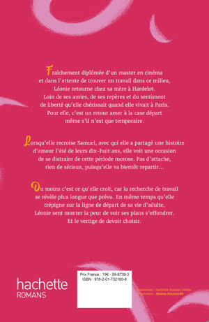 Pour elle, c’est un retour amer à la case départ même s’il n’est que temporaire. Lorsqu’elle recroise Samuel, avec qui elle a partagé une histoire d’amour l’été de leurs dix-huit ans, elle voit une occasion de se distraire de cette période morose. Pas d’attache, rien de sérieux, puisqu’elle va bientôt repartir… Du moins c’est ce qu’elle croit, car la recherche de travail se révèle plus longue que prévu. En même temps qu’elle trépigne sur la ligne de départ de sa vie d’adulte, Léonie sent monter la peur de voir ses plans s’effondrer. Et le vertige de devoir choisir.