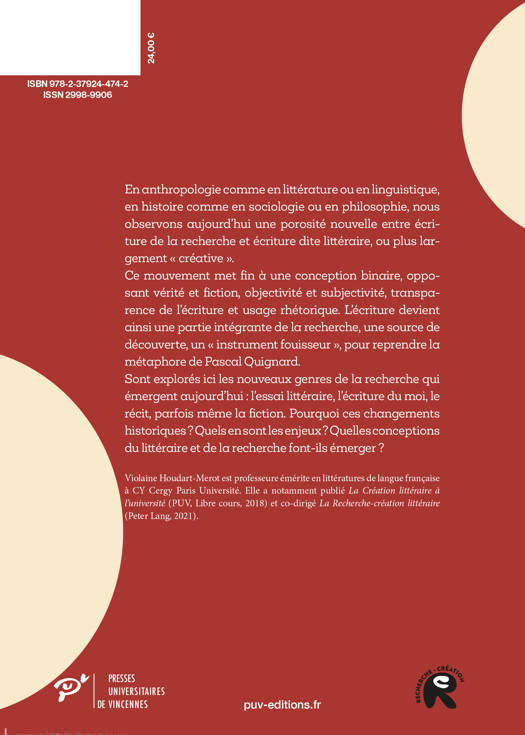 Sont explorés ici les nouveaux genres de la recherche qui émergent aujourd'hui : l'essai littéraire, l'écriture du moi, le récit, parfois même la fiction. Pourquoi ces changements historiques ? Quels en sont les enjeux ? Quelles conceptions du littéraire et de la recherche font-ils émerger ?
