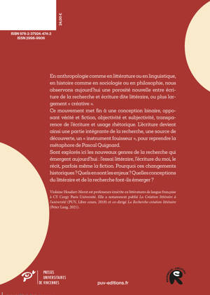 En anthropologie comme en littérature ou en linguistique, en histoire comme en sociologie ou en philosophie, nous observons aujourd'hui une porosité nouvelle entre écriture de la recherche et écriture dite littéraire, ou plus largement « créative ».