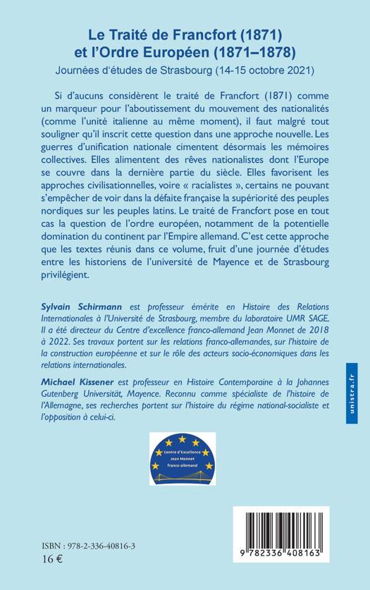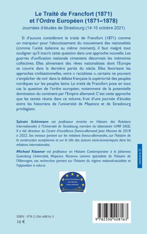 Si d'aucuns considèrent le traité de Francfort (1871) comme un marqueur pour l'aboutissement du mouvement des nationalités (comme l'unité italienne au même moment), il faut malgré tout souligner qu'il inscrit cette question dans une approche nouvelle. Les guerres d'unification nationale cimentent désormais les mémoires collectives. Elles alimentent des rêves nationalistes dont l'Europe se couvre dans la dernière partie du siècle. Elles favorisent les approches civilisationnelles, voire racialistes, certains ne pouvant s'empêcher de voir dans la défaite française la supériorité des peuples nordiques sur les peuples latins. Le traité de Francfort pose en tout cas la question de l'ordre européen, notamment de la potentielle domination du continent par l'Empire allemand. C'est cette approche que les textes réunis dans ce volume, fruit d'une journée d'études entre les historiens de l'université de Mayence et de Strasbourg privilégient.