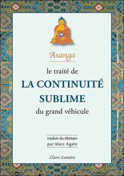 Le Traité de la Continuité sublime du grand véhicule fut composé en Inde au début du Ve siècle de notre ère par Asanga, l’un des philosophes bouddhistes majeurs de l’Inde ancienne. Il compte parmi les textes les plus importants du Grand Véhicule. Cette continuité sublime est la trame infinie qui forme le tissu de toutes nos expériences. Elle est la toile de fond commune à tous les êtres, qui claque aux vents de l’esprit et bat à la mesure de l’illusion, où se dessinent au gré des actes et des pensées les histoires personnelles. Base des naissances et des morts, de toutes les destinées et de tous les accomplissements, elle est la dimension spirituelle de chacun, la nature de bouddha que rien n’altère, l’espace infiniment ouvert et clair de l’éveil omniprésent.