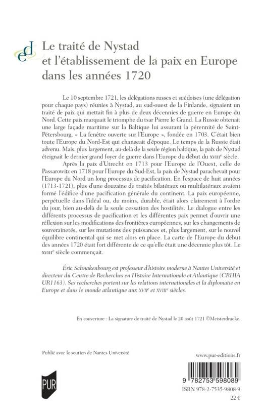 Le 10 septembre 1721, les délégations russes et suédoises (une délégation pour chaque pays) réunies à Nystad, au sud-ouest de la Finlande, signaient un traité de paix qui mettait fin à plus de deux décennies de guerre en Europe du Nord. Cette paix marquait le triomphe du tsar Pierre le Grand. La Russie obtenait une large façade maritime sur la Baltique lui assurant la pérennité de Saint-Pétersbourg, « La fenêtre ouverte sur l’Europe », fondée en 1703. C’était bien toute l’Europe du Nord-Est qui changeait d’époque. Le temps de la Russie était advenu. Mais, plus largement, au-delà de la seule région baltique, la paix de Nystad éteignait le dernier grand foyer de guerre dans l’Europe du début du XVIIIe siècle.