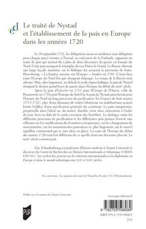 Après la paix d’Utrecht en 1713 pour l’Europe de l’Ouest, celle de Passarowitz en 1718 pour l’Europe du Sud-Est, la paix de Nystad parachevait pour l’Europe du Nord un long processus de pacification. En l’espace de huit années (1713-1721), plus d’une douzaine de traités bilatéraux ou multilatéraux avaient formé l’édifice d’une pacification générale du continent. La paix européenne, perpétuelle dans l’idéal ou, du moins, durable, était alors clairement à l’ordre du jour, bien au-delà de la seule cessation des hostilités. Le dialogue entre les différents processus de pacification et les différentes paix permet d’ouvrir une réflexion sur les modifications des frontières européennes, sur les changements de souverainetés, sur les mutations des puissances et, plus largement, sur le nouvel équilibre continental qui se met alors en place. La carte de l’Europe du début des années 1720 était fort différente de ce qu’elle était une décennie plus tôt. Le XVIIIe siècle commençait.