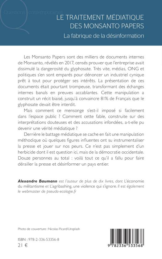 Les Monsanto Papers sont des milliers de documents internes de Monsanto, révélés en 2017, censés prouver que l'entreprise avait dissimulé la dangerosité du glyphosate. Très vite, médias, ONG et politiques s'en sont emparés pour dénoncer un industriel cynique prêt à tout pour protéger ses intérêts. La présentation de ces documents était pourtant trompeuse, transformant des échanges internes banals en preuves accablantes. Cette manipulation a construit un récit biaisé, jusqu'à convaincre 81% de Français que le glyphosate devait être interdit. Mais comment ce mensonge s'est-il imposé si facilement dans l'espace public ? Comment cette fable, construite sur des interprétations douteuses et des accusations infondées, a-t-elle pu devenir une vérité médiatique ? Derrière le battage médiatique se cache en fait une manipulation méthodique où quelques figures influentes ont su instrumentaliser la presse et jouer sur nos peurs. Ce n'est pas simplement d'un herbicide dont il est question ici, mais de la démocratie occidentale. Douze personnes au total: voilà tout ce qu'il a fallu pour faire dérailler la presse et désinformer un pays entier.