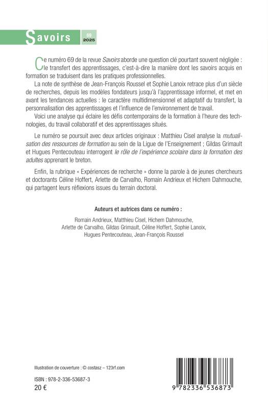 Ce numéro 69 de la revue Savoirs aborde une question clé pourtant souvent négligée: le transfert des apprentissages, c'est-à-dire la manière dont les savoirs acquis en formation se traduisent dans les pratiques professionnelles. La note de synthèse de Jean-François Roussel et Sophie Lanoix retrace plus d'un siècle de recherches, depuis les modèles fondateurs jusqu'à l'apprentissage informel, et met en avant les tendances actuelles: le caractère multidimensionnel et adaptatif du transfert, la personnalisation des apprentissages et l'influence de l'environnement de travail. Voici une analyse qui éclaire les défis contemporains de la formation à l'heure des technologies, du travail collaboratif et des apprentissages situés. Le numéro se poursuit avec deux articles originaux: Matthieu Cisel analyse la mutualisation des ressources de formation au sein de la Ligue de l'Enseignement; Gildas Grimault et Hugues Pentecouteau interrogent le rôle de l'expérience scolaire dans la formation des adultes apprenant le breton. Enfin, la rubrique Expériences de recherche donne la parole à de jeunes chercheurs et doctorants Céline Hoffert, Arlette de Carvalho, Romain Andrieux et Hichem Dahmouche, qui partagent leurs réflexions issues du terrain doctoral.