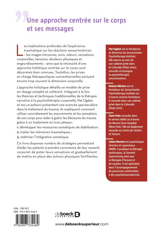 Pour la première fois dans la littérature, ce livre adopte une approche holistique proposant un modèle de prise en charge à la fois complet et cohérent. Intégrant les théories et techniques traditionnelles de la thérapie narrative à la psychothérapie corporelle, Pat Ogden et ses co-auteurs présentent une avancée spectaculaire dans le traitement du trauma et expliquent comment utiliser concrètement les mouvements et les sensations de son corps pour aider à guérir les blessures du trauma.