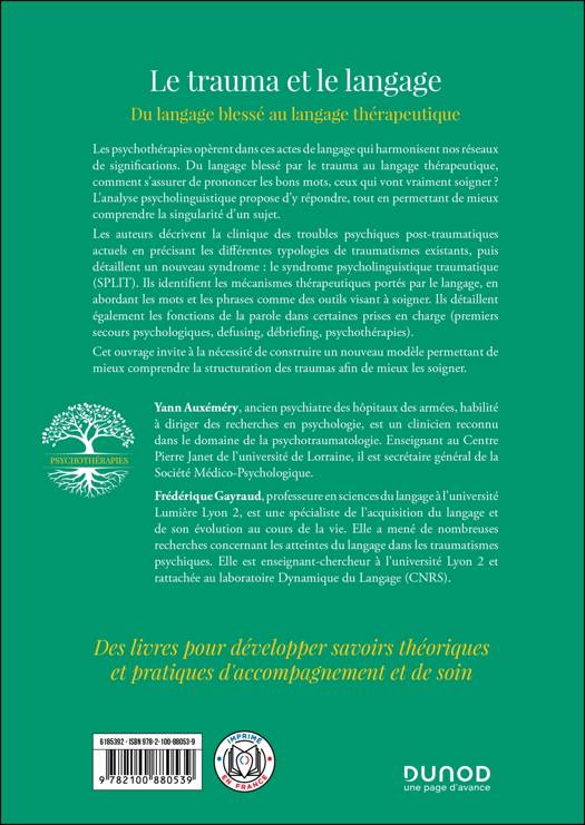 Les auteurs décrivent la clinique des troubles psychiques post-traumatiques actuels en précisant les différentes typologies de traumatismes existants, puis détaillent un nouveau syndrome : le syndrome psycholinguistique traumatique (SPLIT). Ils identifient les mécanismes thérapeutiques portés par le langage, en abordant les mots et les phrases comme des outils visant à soigner. Ils détaillent également les fonctions de la parole dans certaines prises en charge (premiers secours psychologiques, defusing, débriefing, psychothérapies).