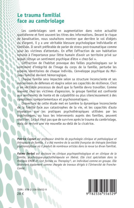 Les cambriolages sont en augmentation dans notre actualité quotidienne et font souvent les titres des informations. Devant le risque de banalisation, nous souhaitons montrer que derrière le vol d’objets ou d’argent, il y a une véritable blessure psychologique individuelle et familiale. Il serait préférable de parler de stress post-traumatique comme pour les victimes d’attentats. En effet l’effraction de son habitation renvoie à l’importance pour l’être humain d’avoir un territoire privé sur lequel s’étaye un sentiment psychique d’être « chez-Soi». L’effraction de l’habitat provoque des failles psychologiques sur le sentiment d’intégrité de l’image du corps de la famille, perturbe les repères identitaires de chaque individu. L’enveloppe psychique du Moipeau familial devient hémorragique. Chaque famille sera impactée selon sa structure inconsciente et ses mécanismes de défenses et réagira selon ses capacités de résilience. C’est à un véritable processus de deuil que la famille devra travailler. Comme souvent chez les victimes d’agression, le groupe familial est confronté aux sentiments de honte et de culpabilité ou plus silencieusement à des symptômes comportementaux et psychosomatiques. L’ouverture de cette étude met en lumière la dynamique inconsciente de la famille face aux catastrophes de la vie, et les capacités d’auto réparation que les pratiques psychothérapiques utilisées par les psychologues, ou tous les intervenants auprès des familles, peuvent réactiver. Le but n’est pas que de survivre après le trauma du cambriolage, mais de revivre une vie nouvelle au-delà de la cicatrice.