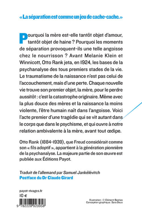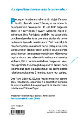 Livre précurseur sur le psychisme des premiers stades de la vie, «Le Traumatisme de la naissance» a permis à Melanie Klein ou Donald Winnicott de construire leur oeuvre. Pourquoi la mère est-elle tantôt objet d'amour, tantôt objet de haine ? Pourquoi les moments de séparation sont-ils générateurs d'une si profonde angoisse chez le nourrisson ? Pour Otto Rank, que Freud considérait comme son "fils adoptif", le traumatisme de la naissance n'est pas celui de l'accouchement, il s'agit plutôt d'une perte. Chaque nouvelle vie trouve son premier objet, la mère, pour le perdre aussitôt : c'est la catastrophe originaire. Même avec la plus douce des mères et la naissance la moins violente, l'être humain naît dans l'angoisse. Voici l'acte premier d'une tragédie qui se vit autant dans le corps que dans le psychisme, et qui ouvre à notre relation ambivalente à la mère, avant tout oedipe.