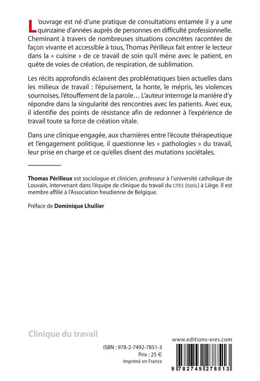 L’ouvrage est né d’une pratique de consultations entamée il y a une quinzaine d’années auprès de personnes en difficulté professionnelle. Cheminant à travers de nombreuses situations concrètes racontées de façon vivante et détaillée, il fait entrer le lecteur dans la « cuisine » d’une pratique peu étudiée jusqu’ici. Des récits de cas approfondis éclairent des problématiques bien actuelles dans les milieux de travail : l’épuisement, la honte, le mépris, les violences sournoises, l’étouffement de la parole… L’ouvrage interroge la manière d’y répondre, dans la singularité des rencontres avec des patients, pour redonner à l’expérience de travail sa force de création vitale. Il soutient une clinique engagée, aux charnières entre l’écoute thérapeutique et l’engagement politique.