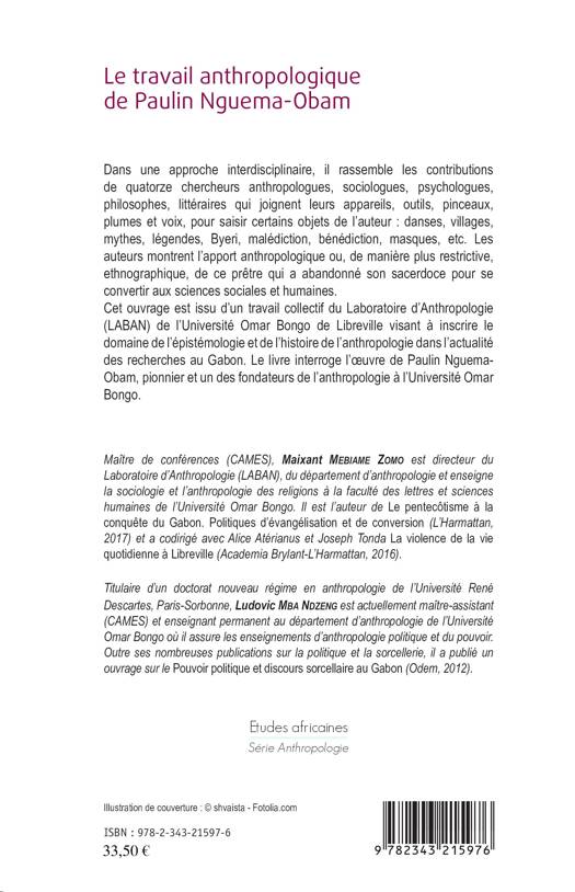 Ce livre interroge l'oeuvre de Paulin Nguema-Obam, pionnier et un des fondateurs de l'anthropologie à l'Université Omar Bongo. Dans une approche interdisciplinaire, il rassemble les contributions de quatorze chercheurs pour saisir certains objets de Paulin Nguema-Obam : danses, villages, mythes, légendes, Byeri, malédiction, bénédiction, masques, etc. Les auteurs montrent l'apport anthropologique ou, de manière plus restrictive, ethnographique, de ce prêtre qui a abandonné son sacerdoce pour se convertir aux sciences sociales et humaines.