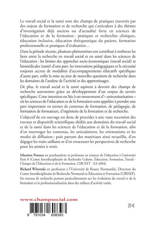 Le travail social et la santé sont des champs de pratiques traversés par des enjeux de formation et de recherche qui s’articulent à des thèmes d’investigation déjà anciens ou d’actualité forte en sciences de l’éducation et de la formation : pratiques et recherches cliniques, éducation inclusive, éducation thérapeutique du patient, formation professionnelle et pratiques d’évaluation... Dans la période récente, plusieurs phénomènes ont contribué à renforcer les liens entre la recherche en travail social et en santé dans les sciences de l’éducation : les limites des approches socio-économiques (travail social) et biomédicales (santé) d’une part, les innovations pédagogiques et la nécessité toujours accrue de modalités d’accompagnements éducatifs spécifiques d’autre part, enfin la mise au jour de nouvelles questions de recherche dans les domaines de l’analyse de l’activité et des apprentissages. De plus, le travail social et la santé aspirent à devenir des champs de recherche autonomes grâce au développement d’un corpus de savoirs spécifiques. Cette intention est liée à un mouvement d’« universitarisation » où les sciences de l’éducation et de la formation sont appelées à prendre une part importante en termes de contenus de formation, de pédagogie, de formation de formateurs, d’ingénierie de la formation et de recherche. L’objectif de cet ouvrage est donc de procéder à une vaste recension des travaux et dispositifs scientifiques dédiés aux domaines du travail social et de la santé dans les sciences de l’éducation et de la formation, afin d’en interroger les contenus, les articulations, les orientations et les modes de diffusion ; puis partant des matériaux ainsi recueillis, d’en dégager les traits saillants et d’en structurer les perspectives de recherche pour les années à venir.