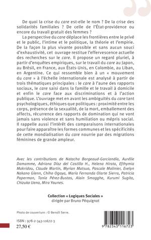 De quoi la crise du care est-elle le nom ? De la crise des solidarités familiales ? De celle de l'État-providence ou encore du travail gratuit des femmes ? La perspective du care déplace les frontières entre le privé et le public, l'intime et le politique, la théorie et l'empirie. Cet ouvrage restitue l'effervescence actuelle des recherches sur le care. Il propose un regard pluriel, à partir d'enquêtes empiriques, sur le travail du care au Japon, au Brésil, en France, aux États-Unis, en Colombie, au Liban et en Argentine.