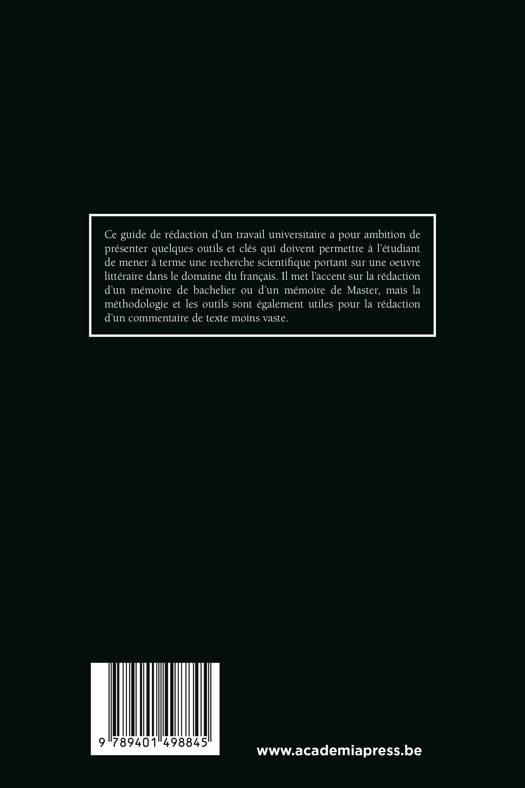 Il met l'accent sur la rédaction d'un mémoire de bachelier ou d'un mémoire de Master, mais la méthodologie et les outils sont également utiles pour la rédaction d'un commentaire de texte moins vaste.