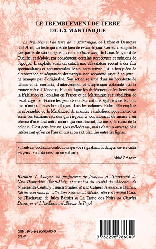 L'action de Le Tremblement de terre de la Martinique, de Lafont et Desnoyer (1840), se situe dans un hors-texte d'interventions et d'expansion coloniale que la France mène à l'époque. Elle souligne les différences et les liens entre la législation et l'opinion en France et en Martinique sur l'abolition de l'esclavage. Elle emploie la géographie de la Martinique de manière symbolique pour mettre en scène les tensions raciales qui risquent à tout moment de mener à un séisme d'une tout autre nature qui entraînerait, lui aussi, la ruine de la colonie.