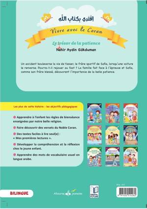 Immergez-vous dans l’univers chaleureux et lumineux de Safia et de sa famille, où chaque jour est l’occasion d’apprendre et de grandir. À travers les petits gestes quotidiens, cette série de 10 livres bilingues guide les enfants vers une compréhension douce et inspirante de valeurs essentielles comme le respect, la générosité, et l’amour familial, le tout éclairé par la sagesse des versets coraniques : 4- Le Trésor de la PatienceUn accident bouleverse la vie de Yasser, le frère sportif de Safia, lorsqu’une voiture le renverse. Pourra-t-il rejouer au foot ? La famille fait face à l’épreuve et Safia, comme son frère blessé, découvrent l’importance de la belle patience.Autres épisodes : 1- Apprendre à s’aimer les uns les autres2- La Confiance : une grande responsabilité 3- La Bienfaisance : les mains du cœur 5- Main dans la main : Fraternité et amour6- Donner c'est aimer 7- Le Temps, un cadeau précieux8- Des Conseils pour grandir ensemble9- Ne juge pas trop vite : Évite la médisance10- Le Messager (ﷺ) de la Miséricorde