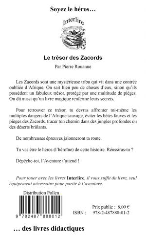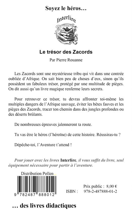 Les Zacords sont une mystérieuse tribu qui vit dans une contrée oubliée d’Afrique. On sait bien peu de choses d’eux, sinon qu’ils possèdent un fabuleux trésor, protégé par une multitude de pièges. On dit aussi qu’un livre magique renferme leurs secrets. Pour retrouver ce trésor, tu devras affronter toi-même les multiples dangers de l’Afrique sauvage, éviter les bêtes fauves et les pièges des Zacords, tracer ton chemin dans des jungles profondes ou des déserts brûlants. De nombreuses épreuves jalonneront ta route. Tu vas être le héros (l’héroïne) de cette histoire. Réussiras-tu ? Dépêche-toi, l’Aventure t’attend !