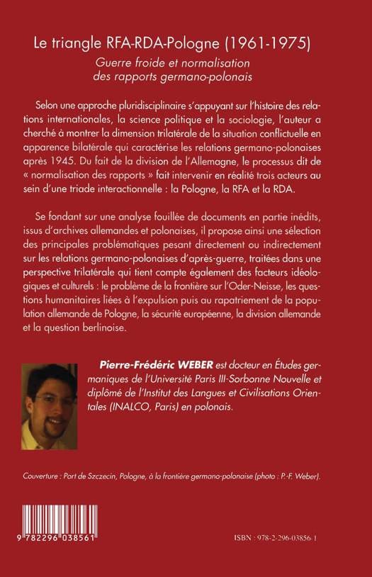 Se fondant sur une analyse fouillée des documents inédits issus des archives allemandes et polonaises, l'auteur met en lumière la dimension trilatérale de la situation conflictuelle en apparence bilatérale qui caractérise les relations germano-polonaises après 1945. Sont abordés la question de la frontière sur l'Oder-Neisse, l'expulsion puis le rapatriement de la population allemande de Pologne, la sécurité européenne, la division allemande et la question berlinoise.