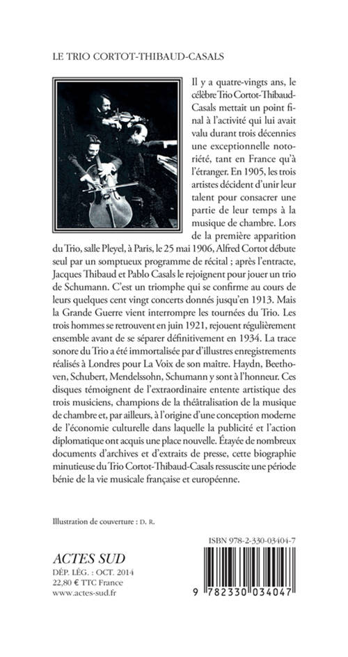 Il y a quatre-vingts ans, le célèbre Trio Cortot-Thibaud- Casals mettait un point final à l'activité qui lui avait valu durant trois décennies une exceptionnelle notoriété, tant en France qu'à l'étranger. En 1905, les trois artistes décident d'unir leur talent pour consacrer une partie de leur temps à la musique de chambre. Lors de la première apparition du Trio, salle Pleyel, à Paris, le 25 mai 1906, Alfred Cortot débute seul par un somptueux programme de récital ; après l'entracte, Jacques Thibaud et Pablo Casals le rejoignent pour jouer un trio de Schumann. C'est un triomphe qui se confirme au cours de leurs quelques cent vingt concerts donnés jusqu'en 1913. Mais la Grande Guerre vient interrompre les tournées du Trio. Les trois hommes se retrouvent en juin 1921, rejouent régulièrement ensemble avant de se séparer définitivement en 1934. La trace sonore du Trio a été immortalisée par d'illustres enregistrements réalisés à Londres pour La Voix de son maître. Haydn, Beethoven, Schubert, Mendelssohn, Schumann y sont à l'honneur. Ces disques témoignent de l'extraordinaire entente artistique des trois musiciens, champions de la théâtralisation de la musique de chambre et, par ailleurs, à l'origine d'une conception moderne de l'économie culturelle dans laquelle la publicité et l'action diplomatique ont acquis une place nouvelle. Étayée de nombreux documents d'archives et d'extraits de presse, cette biographie minutieuse du Trio Cortot-Thibaud-Casals ressuscite une période bénie de la vie musicale française et européenne.
