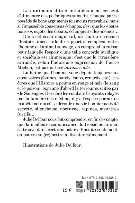Les animaux dits nuisibles ne cessent d'alimenter des polemiques sans fin. Chaque partie possede de bons arguments (du moins recevables) mais si l'impossible consensus echappe, c'est que les betes noires , sujets des debats, echappent elles-memes... Dans cet essai magistral, ou l'auteure retrace l'histoire ancestrale du rapport si complexe entre l'homme et l'animal sauvage, on comprend la raison pour laquelle l'espoir d'une telle concorde juridique et societale est chimerique: c'est que le troisieme animal , selon l'heureuse expression de Pierre Michon, est par nature insaisissable La haine que l'homme voue depuis toujours aux carnassiers (fouines, putois, loups, renards, etc.), ces etres que l'Histoire a peints en rouge et noir (le sang et le poison), exprime d'abord la terreur suscitee par le Sauvage . Derriere les combats bruyants relayes par la lumiere des medias, il y a l'espace poreux de la bete noire ou se deroule une vie honnie: activite secrete, silencieuse, nocturne, rapines, meurtres furtifs... Julie Delfour nous fait comprendre, en fin de compte, que la meilleure connaissance du troisieme animal se trouve dans certains polars. Ensuite seulement, on pourra se (re)mettre a discuter calmement.