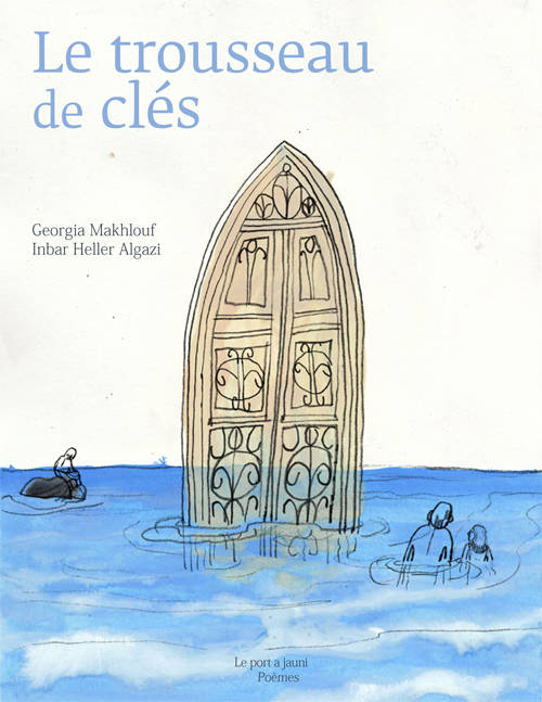 Puis nous avons confié l’illustration de cette histoire poétique à Inbar Heller Algazi, israélienne ayant grandi à Jaffa, engagée dans la lutte anticoloniale et antimilitariste en Palestine, vivant en France depuis peu. Pour donner un écho graphique au thème de la clé, elle a choisi les portes : les portes de l’ancienne ville arabe de Jaffa sont enlevées des maisons traditionnelles et revendues. Elles trônent devant les boutiques des antiquaires, séparées de leur maison, elles n’ouvrent plus sur rien. Dans les dessins d’Inbar Heller Algazi, elles ouvrent sur la mer et participent d’un paysage panoramique où l’illustratrice revisite les grands thèmes de la poésie de Mahmoud Darwich – le fil à linge, le nid, les oiseaux, la maison… – croisés avec les souvenirs de sa maison familiale en bord de la mer. Au-delà de la référence poétique, Inbar Heller Algazi détourne ces motifs : l’oiseau est un martin-triste, espèce invasive qui chasse les autres de leur nid ; le grillage est tissé comme les fils à linge et il envahit tout ; le fil à linge devient aussi cheveux, corde de l’âne, fil de cannes à pêche, palmes aux vent, brindilles dans le bec de l’oiseau ; les portes baignent dans l’eau et ouvrent sur le vide infini. Inbar Heller Algazi ramène la clé dans son monde d’origine et dans l’intimité des lieux, là où ses propriétaires palestiniens ne peuvent plus aller. Elle utilise, dit-elle, son « privilège » d’israélienne pour donner à revoir les lieux interdits.