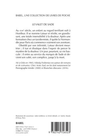 Au XVIIIe siècle, un enfant au regard terrifiant naît à Honfleur. Il se nomme Latour et révèle, en grandissant, une totale insensibilité à la douleur. Après une formation chez un taxidermiste, il quitte la Normandie pour Paris où commence vraiment son aventure. Obsédé par son infirmité, Latour devient meurtrier ; il tue et dissèque dans l'espoir de percer le mystère de la douleur. Un jour, pourtant, sa vie bascule : il entre au service du marquis de Sade et devient son valet, son complice, jusqu'à la mort.