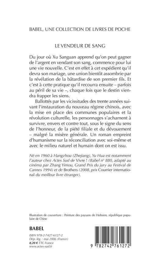 Du jour où Xu Sanguan apprend qu'on peut gagner de l'argent en vendant son sang, commence pour lui une vie nouvelle. C'est en effet à cet expédient qu'il devra son mariage, une union bientôt assombrie par la révélation de la bâtardise de son premier fils. Et c'est à cette pratique qu'il recourra ensuite - parfois au péril de sa vie -, chaque fois que le destin viendra frapper les siens. Ballottés par les vicissitudes des trente années suivant l'instauration du nouveau régime chinois, avec la mise en place des communes populaires et la révolution culturelle, les personnages s'acharnent à survivre, envers et contre tout, sous le signe du sens de l'honneur, de la piété filiale et du dévouement - malgré la misère générale. Un roman empreint d'humanisme sur la réconciliation avec soi-même et avec le milieu naturel et humain dont on est issu.
