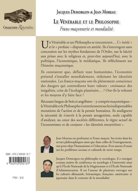 Récusant langue de bois et angélisme - y compris maçonniques - le Vénérable et le Philosophes s'entretiennent sur les indispensables mutations de l'action et de la pensée humaines. Ils soulignent la nécessité de s'ouvrir à la pensée antagoniste, seule capable d'analyser, au coeur des sociétés différentes, le règne actuel de l'économisme et de conjurer « les identités meurtrières ».