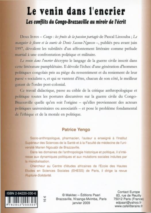 Le venin dans l'encrier décrypte le langage de la guerre civile inscrit dans cette littérature pamphlétaire. Il dévoile l'échec d'une génération d'hommes politiques congolais pris au piège du ressentiment et du reniement de leur passé « socialiste », et qui se vantent d'être, chacun de son côté, le meilleur garant de l'ordre post-colonial.