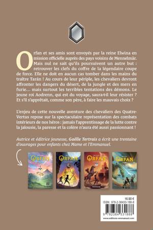 Orfan et ses amis sont envoyés par la reine Elwina en mission officielle auprès des pays voisins de Mennelmär. Mais nul ne sait qu’ils poursuivent un autre but : retrouver les clefs du coffre de la légendaire coupe de force. Elle ne doit en aucun cas tomber dans les mains du traître Tarán ! Au cours de leur périple, les chevaliers devront affronter les dangers du désert, de la jungle et des mers en furie… mais surtout les terribles tentations des démons. Le jeune roi Aodrenn, qui est du voyage, saura-t-il leur résister ? Et s’il s’apprêtait, comme son père, à faire les mauvais choix ? L’enjeu de cette nouvelle aventure des chevaliers des Quatre-Vertus repose sur la spectaculaire représentation des combats intérieurs de nos héros : jamais l’apprentissage de la lutte contre la jalousie, la paresse et la colère n’aura été aussi passionnant ! À partir de 10 ans.