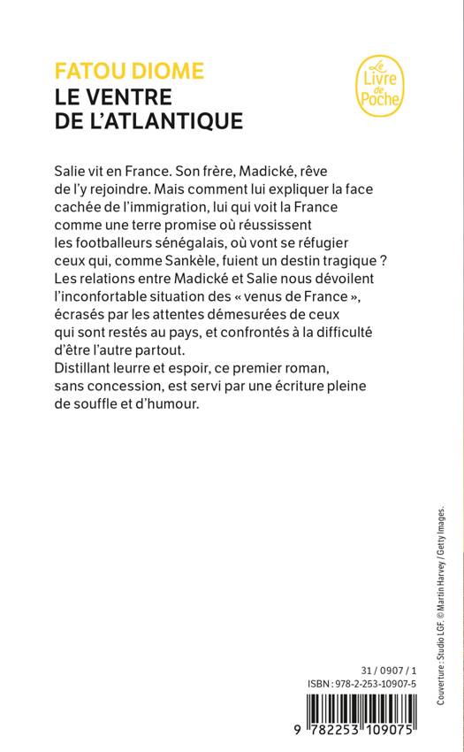 Salie vit en France. Son frère, Madické, rêve de l’y rejoindre et compte sur elle. Mais comment lui expliquer la face cachée de l’immigration, lui qui voit la France comme une terre promise où réussissentles footballeurs sénégalais, où vont se réfugier ceux qui, comme Sankèle, fuient un destin tragique ? Les relations entre Madické et Salie nous dévoilent l’inconfortable situation des « venus de France », écrasés par les attentes démesurées de ceux qui sont restés au pays et confrontés à la difficulté d’être l’autre partout. Distillant leurre et espoir, Le Ventre de l’Atlantique charrie entre l’Europe et l’Afrique des destins contrastés. Car, même si la souffrance de ceux qui restent est indicible, il s’agit de partir, voguer, libre comme une alguede l’Atlantique.