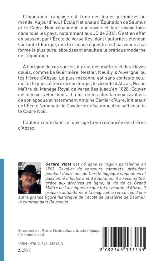 L'équitation française est l'une des toutes premières au monde. C'est en passant par l'Ecole de Versailles, dont l'autorité s'étendait sur toute l'Europe que la science équestre est parvenue à sa forme la plus pure. L'auteur conte dans cet ouvrage la vie romancée des frères d'Abzac, en particulier celle du vicomte d'Abzac. Grand Maître du Manège Royal de Versailles jusqu'en 1828 et écuyer des derniers Bourbons, il a formé les plus fameux cavaliers de son époque.