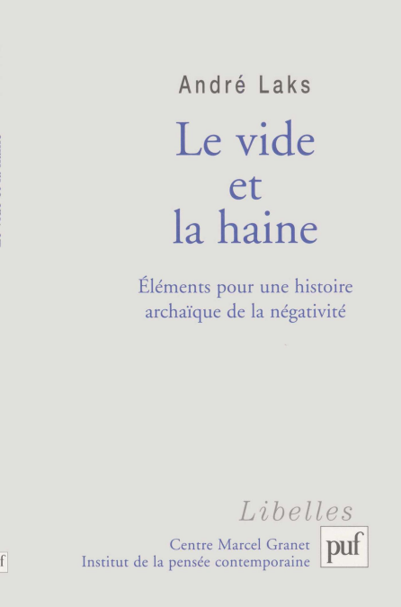 Cet essai développe une communication présentée au colloque « Que faisons-nous du négatif ? » organisé en décembre 2002 par l'Institut de la pensée contemporaine - IPC et dirigé par François Jullien. L'auteur avait posé la question de savoir ce qu'eux, les Grecs, en avaient fait et plus précisément, après Parménide, le penseur de l'Être et celui de l'Amour, après Leucippe, le philosophe du vide (et du plein), après Empédocle, celui de la haine (et de l'amour). Les grecs nous parlent-ils encore de notre négatif ? « On ne peut analyser ce que représentent le vide et la haine, du point de vue d'une histoire du négatif, sans s'arrêter sur Parménide lui-même, non seulement parce que celui-ci livre le fond de positivité dont ces négatifs prennent le contre-pied, mais aussi parce que, en vertu d'un paradoxe qui constitue, comme le dit Ernst Cassirer, "l'une des questions les plus difficiles et les plus obscures, l'une des plus discutées de l'histoire de la philosophie grecque", Parménide fut le premier à se retourner contre lui-même en un geste suicidaire. Le poème de Parménide est en effet traversé par une dualité fondamentale .... Toute chose dans le monde résulte du mélange de deux entités originelles qui présentent toutes les caractéristiques de ce que la tradition philosophique postérieure appellera les éléments. » « C'est justement parce qu'il est que le négatif doit être aboli. Ce n'est pas tout à fait la même chose que d'affirmer avec Platon qu'il ne saurait être pensé ou inversement qu'il peut l'être. »