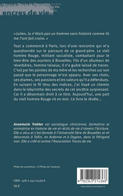 « Julien, tu n'étais pas un homme sans histoire comme ils me l'ont fait croire. » Tout a commencé à Paris, lors d'une rencontre qui m'a questionnée sur le parcours de ce grand-père. Le vieil homme Rouge, militant socialiste, combattant pour le bien-être des ouvriers à Bruxelles. Fils d'un allumeur de réverbères, homme taiseux, il n'a guère laissé de traces. C'est par les paroles de ma mère et les recherches sur son passé que le personnage m'est apparu. Avec ses choix, ses drames, ses passions et les valeurs qu'il a défendues. En suivant le fil ténu des indices, j'ai frayé un chemin dans le labyrinthe des secrets de cet ancêtre surprenant. Car il a désormais droit à ce titre. Aujourd'hui, une part du vieil homme Rouge vit en moi. Ce livre le révèle...