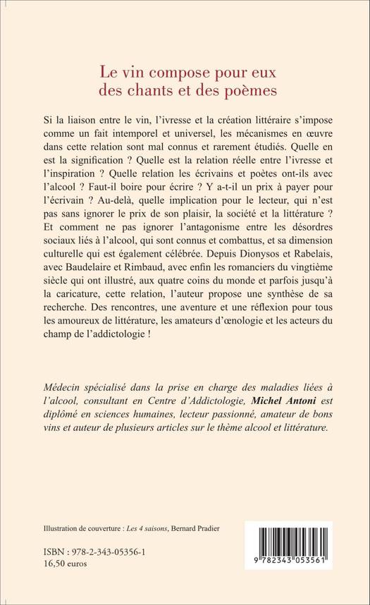 Si la liaison entre le vin, l'ivresse et la création littéraire s'impose comme un fait intemporel et universel, les mécanismes en oeuvre dans cette relation sont mal connus et rarement étudiés. Depuis Dionysos et Rabelais, avec Baudelaire et Rimbaud, avec enfin les romanciers du vingtième siècle qui ont illustré, aux quatre coins du monde et parfois jusqu'à la caricature, cette relation, l'auteur propose ici une synthèse de sa recherche.