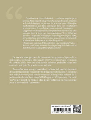 Ce vocabulaire permet de parcourir les grandes lignes de la philosophie de langue allemande à travers l'historique d'environ 60 notions clefs, avec des définitions précises, resituées dans leur contexte, soit près de 300 termes analysés.
