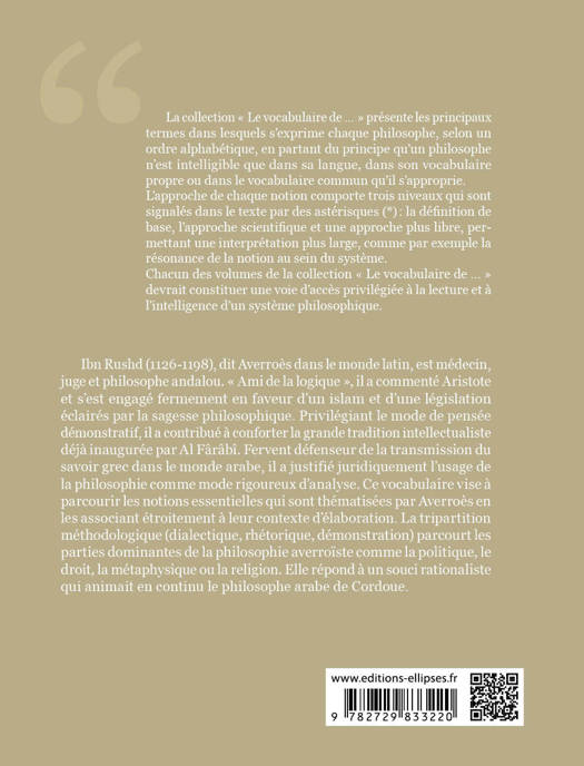 Ibn Rushd (1126-1198), dit Averroès dans le monde latin, est médecin, juge et philosophe andalou. « Ami de la logique », il a commenté Aristote et s’est engagé fermement en faveur d’un islam et d’une législation éclairés par la sagesse philosophique. Privilégiant le mode de pensée démonstratif, il a contribué à conforter la grande tradition intellectualiste déjà inaugurée par Al Fârâbî. Fervent défenseur de la transmission du savoir grec dans le monde arabe, il a justifié juridiquement l’usage de la philosophie comme mode rigoureux d’analyse. Ce vocabulaire vise à parcourir les notions essentielles qui sont thématisées par Averroès en les associant étroitement à leur contexte d’élaboration. La tripartition méthodologique (dialectique, rhétorique, démonstration) parcourt les parties dominantes de la philosophie averroïste comme la politique, le droit, la métaphysique ou la religion. Elle répond à un souci rationaliste qui animait en continu le philosophe arabe de Cordoue.
