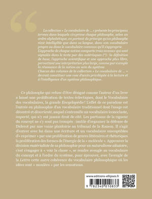 Ce philosophe qui refuse d’être désigné comme l’auteur d’un livre a laissé une prolifération de textes éclectiques, dont le Vocabulaire des vocabulaires, la grande Encyclopédie ! L’effet de ce paradoxe est l’entrée en philosophie d’un vocabulaire traditionnel dont l’usage est décentré et désorienté, auquel s’entremêle un vocabulaire iconoclaste, importé, qui n’y eut jamais droit de cité. Les partisans de la rigueur du concept ne s’y sont pas trompés : inutile d’organiser la défense de Diderot par une vaine plaidoirie au tribunal de la Raison. Il s’agit d’entrer avec lui dans une écriture et un vocabulaire susceptibles d’« exprimer » par une prolifération de genres littéraires et rhétoriques la prolifération des formes de l’énergie de la « molécule ». Approuver la décision matérialiste de sa philosophie pour un naturalisme aléatoire, c’est s’engager à « voir la chose », se rendre aveugle au vocabulaire du concept et à l’ordre du système, pour éprouver, avec l’aveugle de la Lettre cette autre cohérence du vocabulaire philosophique où les idées sont « moulées » par les sensations.