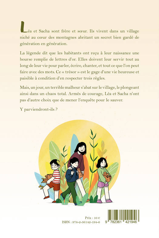 Léa et Sacha sont frère et soeur. Ils vivent dans un village niché au coeur des montagnes abritant un secret bien gardé de génération en génération. <br /> La légende dit que les habitants ont reçu à leur naissance une bourse remplie de lettres d’or. Elles doivent leur servir tout au long de leur vie pour parler, écrire, chanter, et tout ce que l’on peut faire avec des mots. Ce « trésor » est le gage d’une vie heureuse et paisible à condition d’en respecter trois règles. <br /> Mais, un jour, un terrible malheur s’abat sur le village, le plongeant ainsi dans un chaos total. Armés de courage, Léa et Sacha n’ont pas d’autre choix que de mener l’enquête pour le sauver. <br /> Y parviendront-ils ?