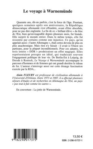 Quelques semaines après son quarantième anniversaire, la République démocratique allemande s'est effondrée. La fin de ce "brillant élève" du bloc de l'Est fut brutale, elle fut ressentie par certains comme une injustice. De Berlin-Est à Leipzig, de Dresde à Rostock, Le Voyage à Warnemünde accompagne le parcours d'hommes et de femmes qui ont grandi derrière le rideau de fer. L'auteur s'interroge aussi sur cette étrange fascination exercée par la RDA...