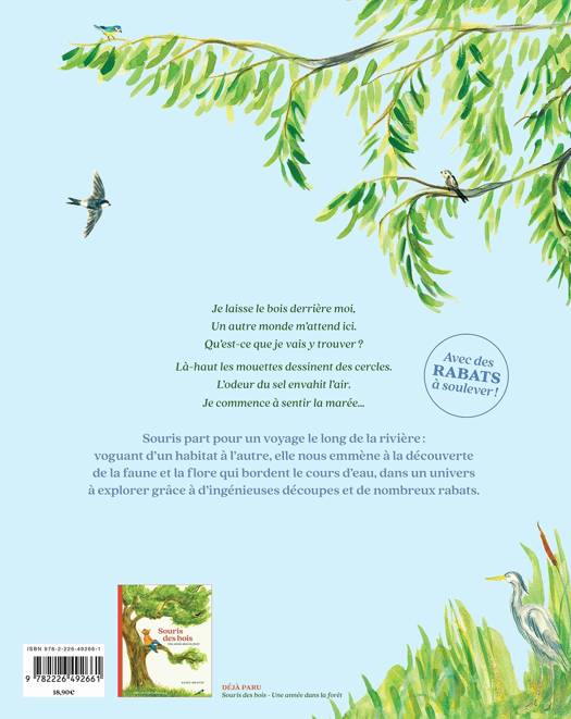 Souris part pour un voyage le long de la rivière : voguant d'un habitat à l'autre, elle nous emmène à la découverte de la faune et de la flore qui bordent le cours d'eau, dans un univers à explorer grâce à d'ingénieuses découpes et de nombreux rabats.
