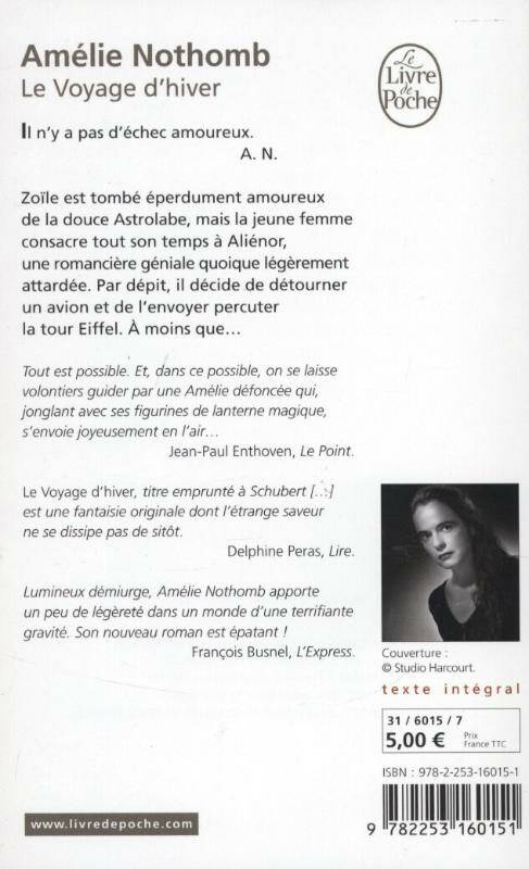 Il n'y a pas d'échec amoureux. A. N.Zoïle est tombé éperdument amoureux de la douce Astrolabe, mais la jeune femme consacre tout son temps à Aliénor, une romancière géniale quoique légèrement attardée. Par dépit, il décide de détourner un avion et de l'envoyer percuter la tour Eiffel. A moins que...Tout est possible. Et, dans ce possible, on se laisse volontiers guider par une Amélie défoncée qui, jonglant avec ses figurines de lanterne magique, s'envoie joyeusement en l'air... Jean-Paul Enthoven, Le Point.Le Voyage d'hiver, titre emprunté à Schubert, [...] est une fantaisie originale dont l'étrange saveur ne se dissipe pas de sitôt. Delphine Peras, Lire.Lumineux démiurge, Amélie Nothomb apporte un peu de légèreté dans un monde d'une terrifiante gravité. Son nouveau roman est épatant ! François Busnel, L'Express.