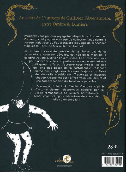 Au cœur de l’univers de Gulliver l’Aventurière, entre Ombre & Lumière. Préparez-vous pour un Voyage Initiatique hors du commun ! Roman graphique, cet ouvrage de collection vous conte le voyage initiatique du Fou à travers les vingt-deux Arcanes Majeurs du Tarot de Marseille traditionnel. Celle band dessinée, emplie de symboles cachés et de savoirs ancestraux dévoilés, est née de la main de la célèbre Artiste Gulliver l’Aventurière. Elle trace une voie pour accéder à la compréhension de ce merveilleux outil qu’est le Tarot. L’auteure nous livre ici les clés de l’un des bases de la cartomancie, l’essence même des vingt-deux Arcanes Majeurs du Tarot de Marseille traditionnel ; offrez-vous une lecture et une compréhension du Tarot sans pareilles ! Passionné, Éclairé & Éveillé, Cartomancien & Cartomancienne, laissez-vous séduire par la vision romanesque de Gulliver l’Aventurière. Tenez-vous prêt pour l’Aventure de votre vie, elle commence ici !