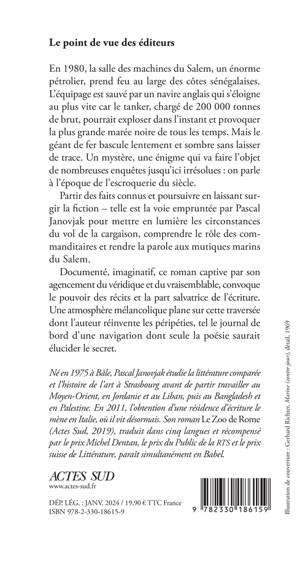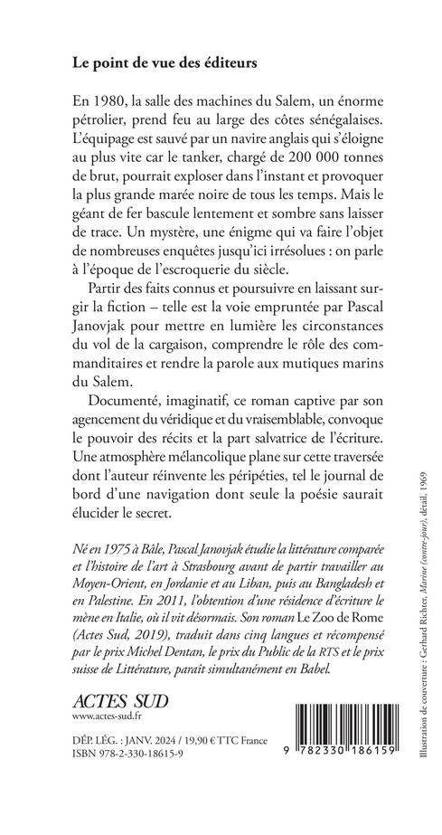 En 1980, la salle des machines du Salem, un énorme pétrolier, prend feu au large des côtes sénégalaises. L'équipage est sauvé par un navire anglais qui s'éloigne au plus vite car le tanker, chargé de 200 000 tonnes de brut, pourrait exploser dans l'instant et provoquer la plus grande marée noire de tous les temps. Mais le géant de fer bascule lentement et sombre sans laisser de trace. Un mystère, une énigme qui va faire l'objet de nombreuses enquêtes jusqu'ici irrésolues : on parle à l'époque de l'escroquerie du siècle. Partir des faits connus et poursuivre en laissant surgir la fiction - telle est la voie empruntée par Pascal Janovjak pour mettre en lumière les circonstances du vol de la cargaison, comprendre le rôle des commanditaires et rendre la parole aux mutiques marins du Salem. Documenté, imaginatif, ce roman captive par son agencement du véridique et du vraisemblable, convoque le pouvoir des récits et la part salvatrice de l'écriture. Une atmosphère mélancolique plane sur cette traversée dont l'auteur réinvente les péripéties, tel le journal de bord d'une navigation dont seule la poésie saurait élucider le secret.