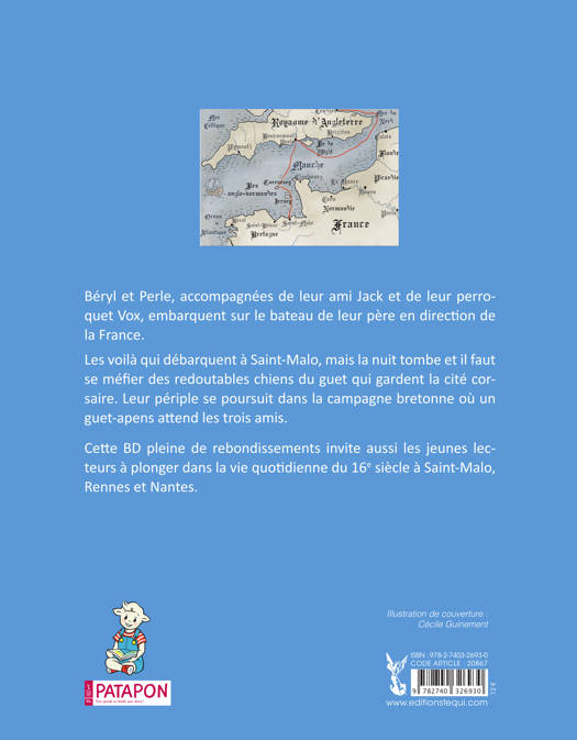 Béryl et Perle, accompagnées de leur ami Jack et de leur perroquet Vox, embarquent sur le bateau de leur père en direction de la France. Saint Thomas More n’est plus avec elles, mais elles ont ses livres et ses conseils pour soigner le mal de mer de Jack ! Les voilà qui débarquent à Saint-Malo, mais la nuit tombe et il faut se méfier des redoutables chiens du guet qui gardent la cité corsaire. Leur périple se poursuit dans la campagne bretonne, elles se perdent et arrivent dans un château médiéval où les Anglais ne sont pas les bienvenus. Un guet-apens les y attend. Et puis… attention au fantôme ! Et qui est ce cavalier qui file à toute allure, poursuivi par des gens d’armes ? Un voleur de collier, dit-on, mais il ressemble étrangement à Mathias, leur ami matelot. À Rennes, c’est un simple moine qui les intrigue : il prend soin des plus pauvres, mais on dit ici qu’il est l’évêque de cette grande ville. Étrange !