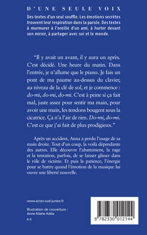 Devant son écran, Anna rêve d'ailleurs et étouffe dans sa vie d'ado qu'elle juge trop étriquée. Après un accident, Anna a eu les tendons de sa main droite sectionnés. Cela signifie ne plus pouvoir s'habiller seule, ne plus porter son plateau au self, être dépendante des autres. Elle découvre l'abattement, le découragement, l'entourage aux petits soins, et la tentation, parfois, de se laisser glisser dans le rôle de victime. Anna va devoir apprendre à se battre, à être patiente devant le long travail de rééducation qui l'attend. Le jour où on la pousse à commencer le piano, son univers paraît encore se rétrécir ; devant cette volée de touches, elle est condamnée à répéter la même douloureuse combinaison de notes : do-mi, ré-fa. Pourtant, sous l'influence de son professeur, Anna sent bientôt s'ouvrir un espace de liberté. Un espoir auquel s'accrocher, pour que peu à peu ses doigts renaissent.