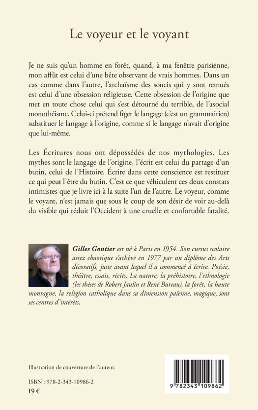 Les Écritures dépossèdent l'Homme de ses mythologies. Les mythes sont le langage de l'origine, l'écrit est celui du partage d'un butin, celui de l'Histoire. Écrire dans cette conscience c'est restituer ce qui peut l'être du butin. C'est ce que véhiculent ces constats intimistes livrés ici par l'auteur. Le voyeur, comme le voyant, n'est jamais que sous le coup de son désir de voir au-delà du visible qui réduit l'Occident à une cruelle et confortable fatalité.